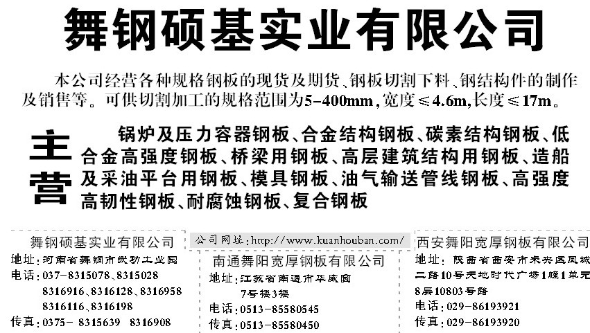 地址:河南省舞钢市武功工业园电话:037-8315078、8315028 8316916、8316128、8316958 8316116、8316198传真:0375- 8315639 8316908